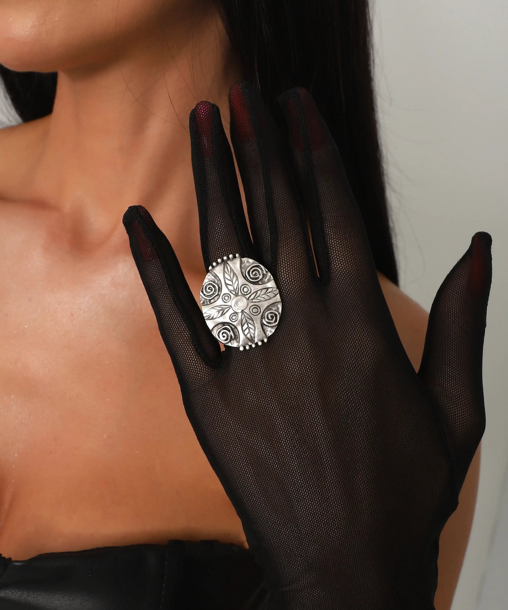 Antik Desenli Gümüş Kaplama Büyük Yüzük