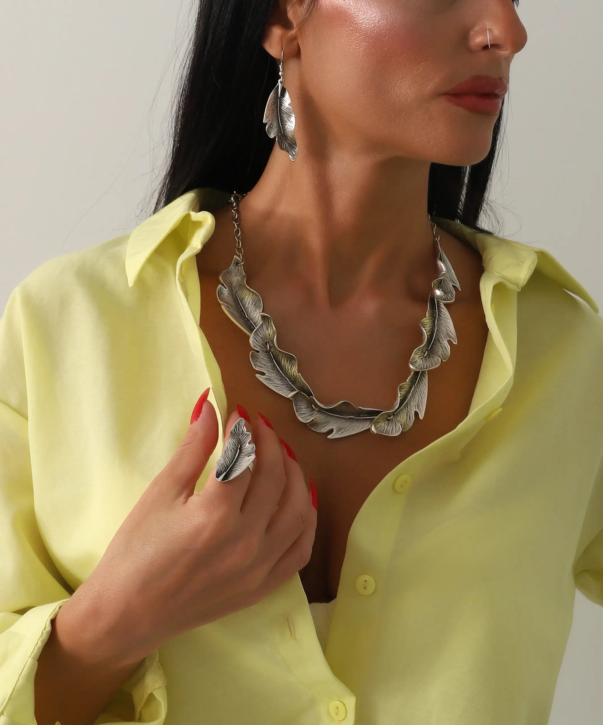 Doğal Dokulu Gümüş Kaplama Yaprak Kolye