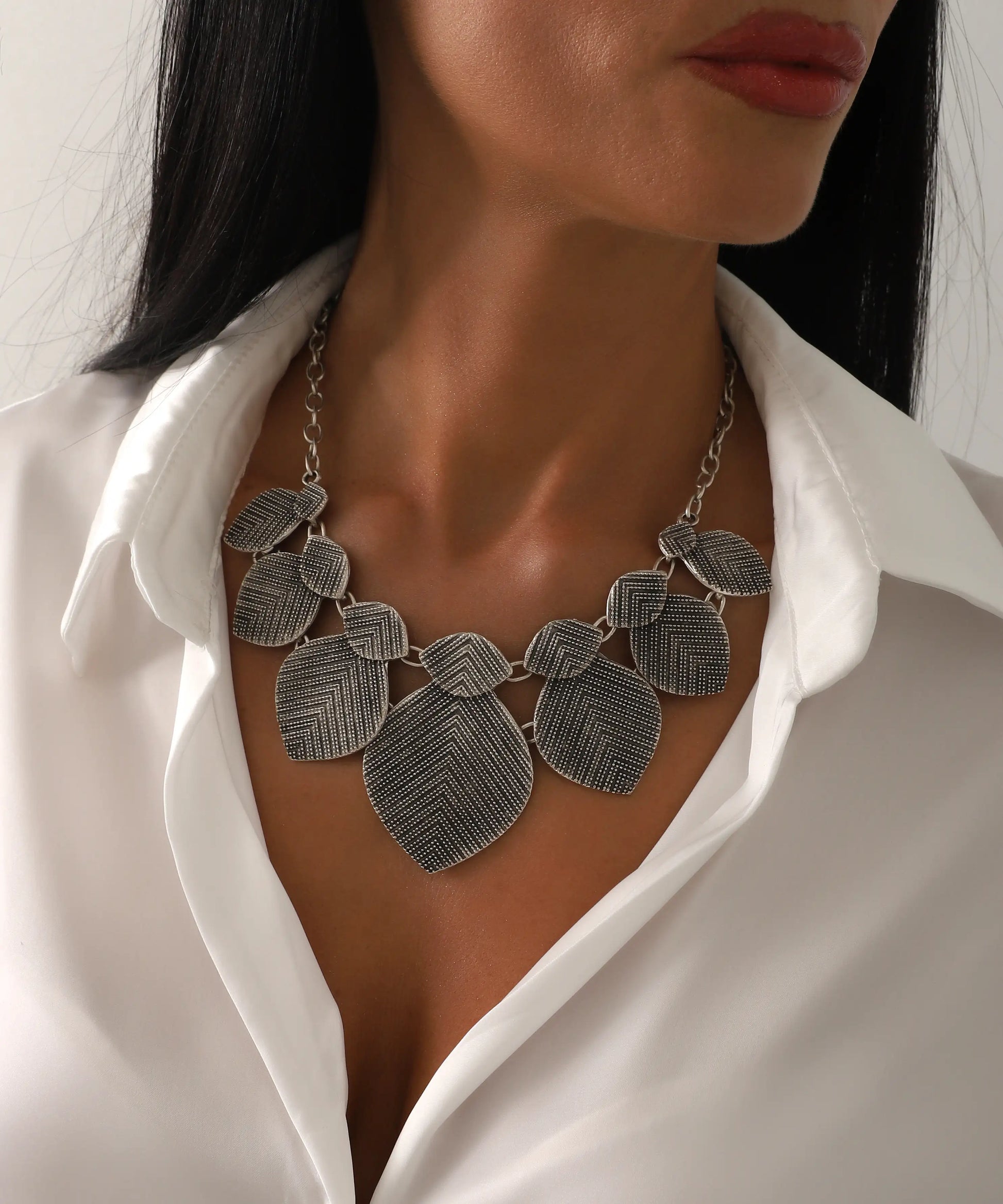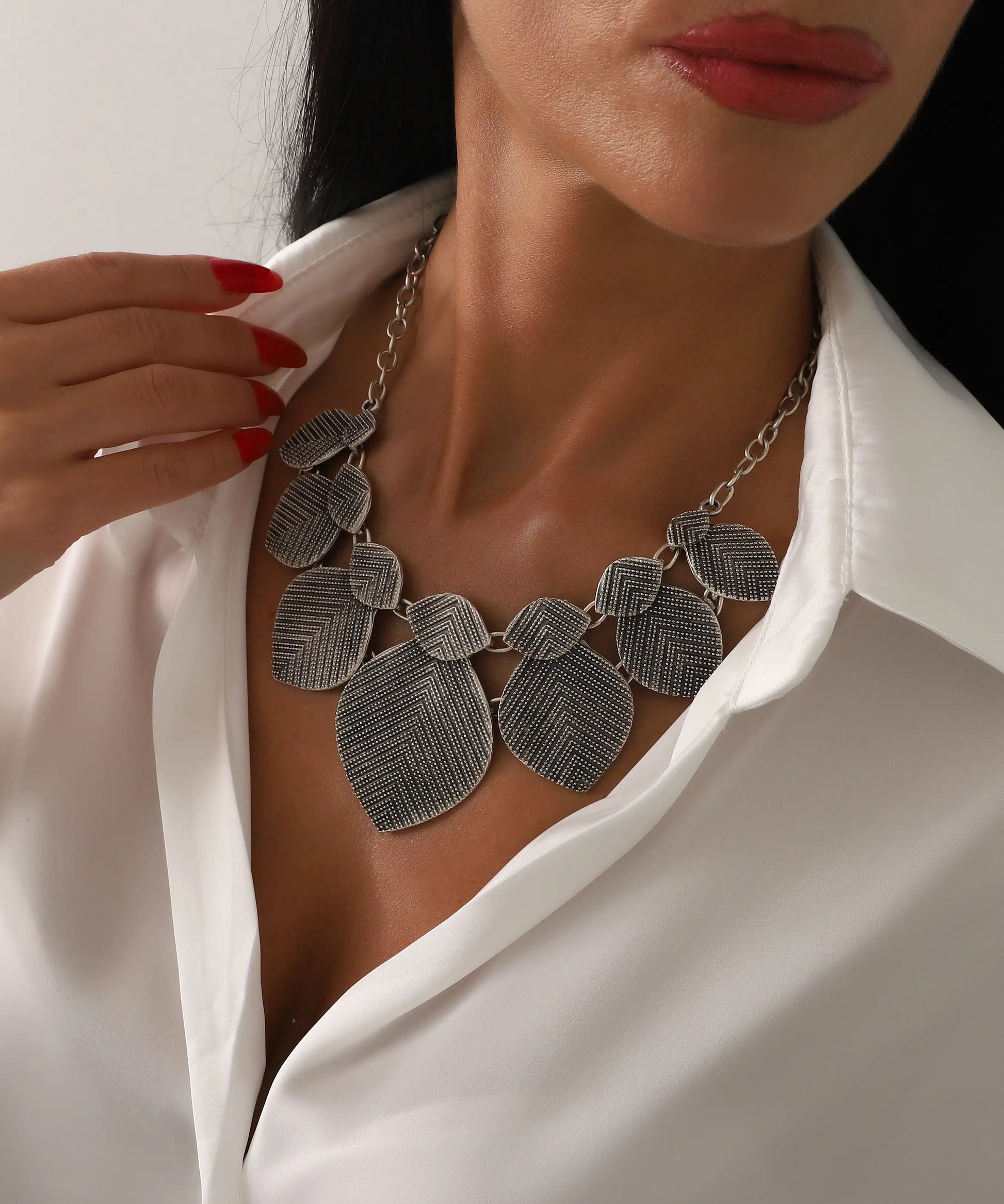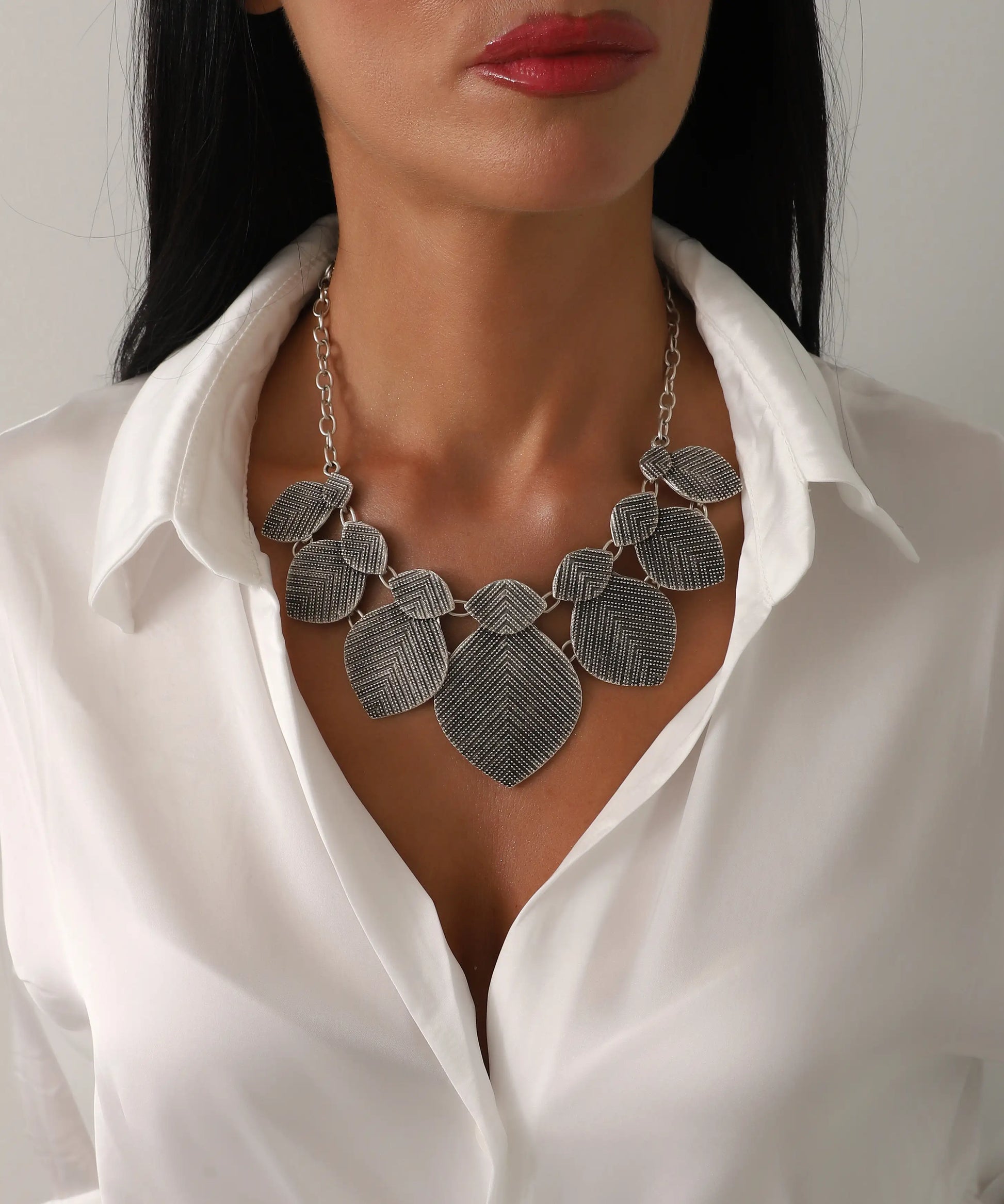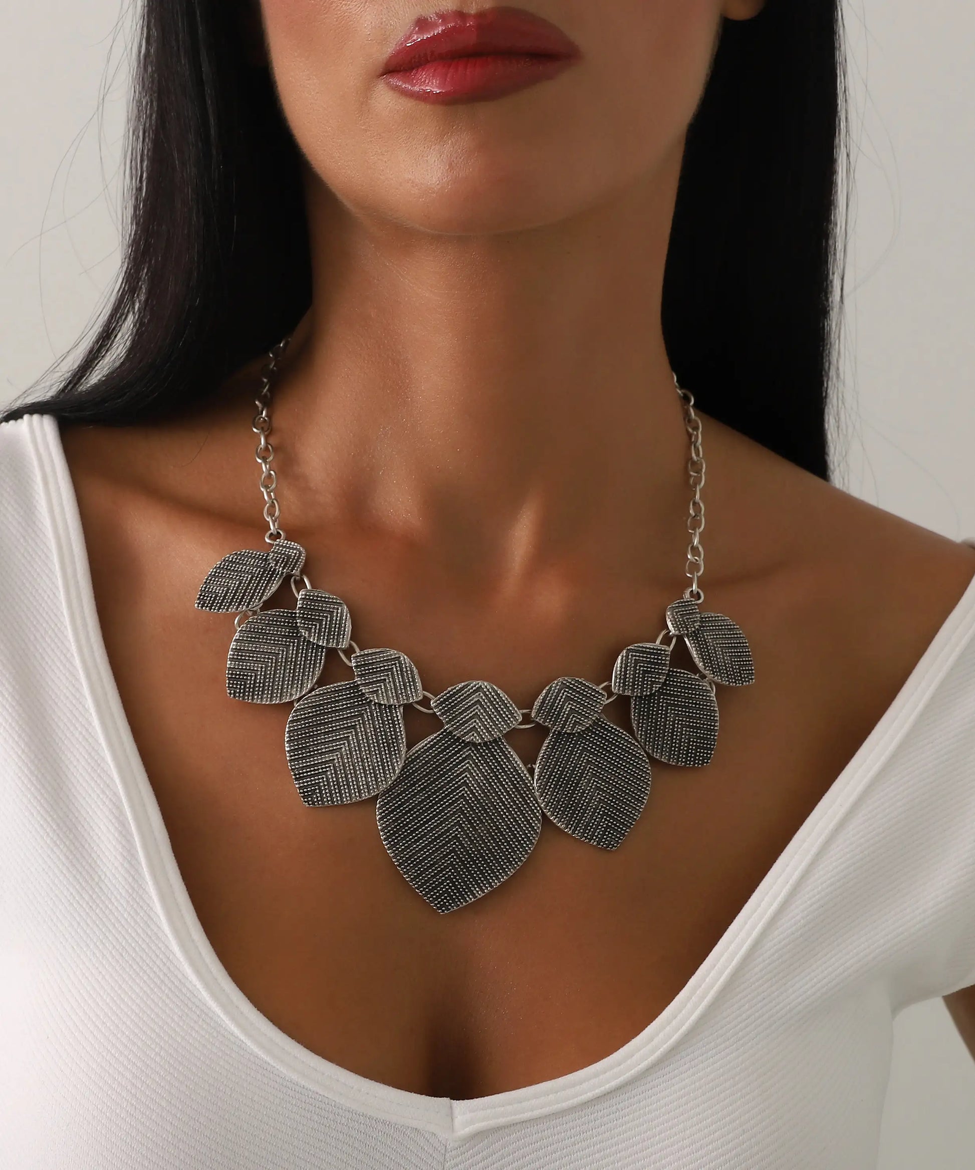 Dokulu Gümüş Kaplama Büyük Yaprak Motifli Kolye