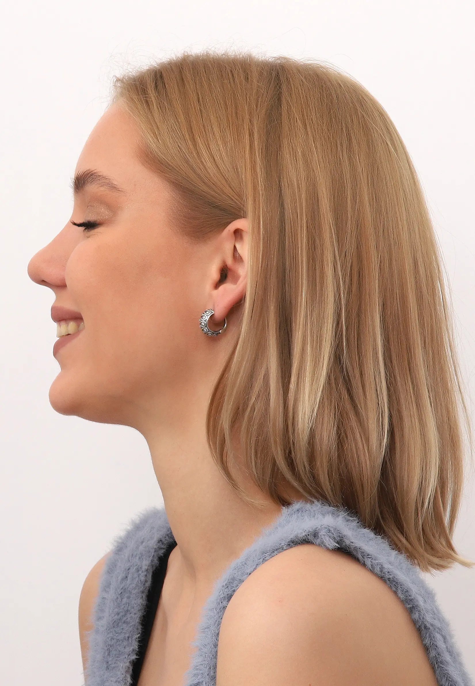 Dokulu Taş Detaylı Gümüş Halka Küpe