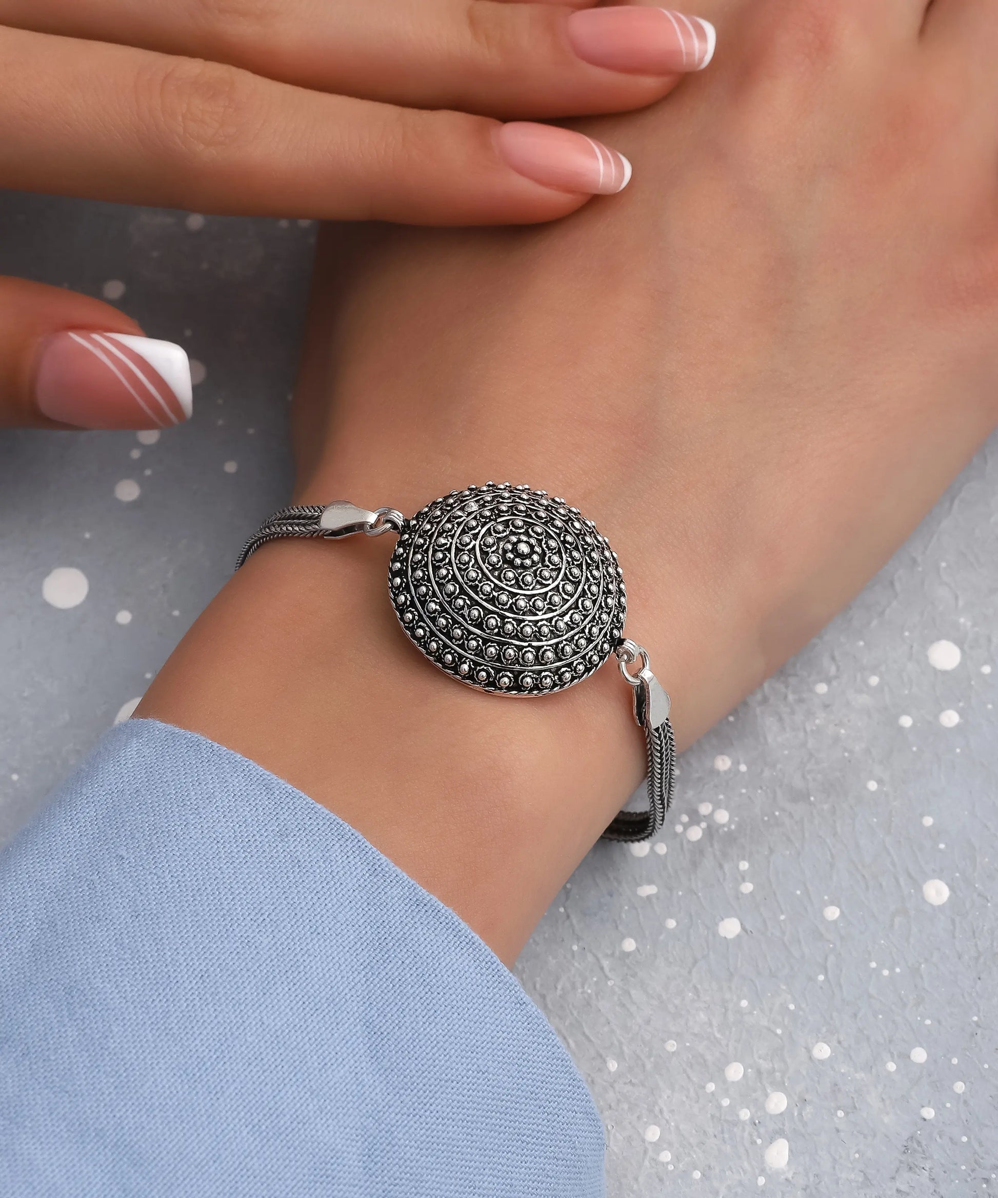 Kabartma Nokta Desenli Yuvarlak Gümüş Bileklik