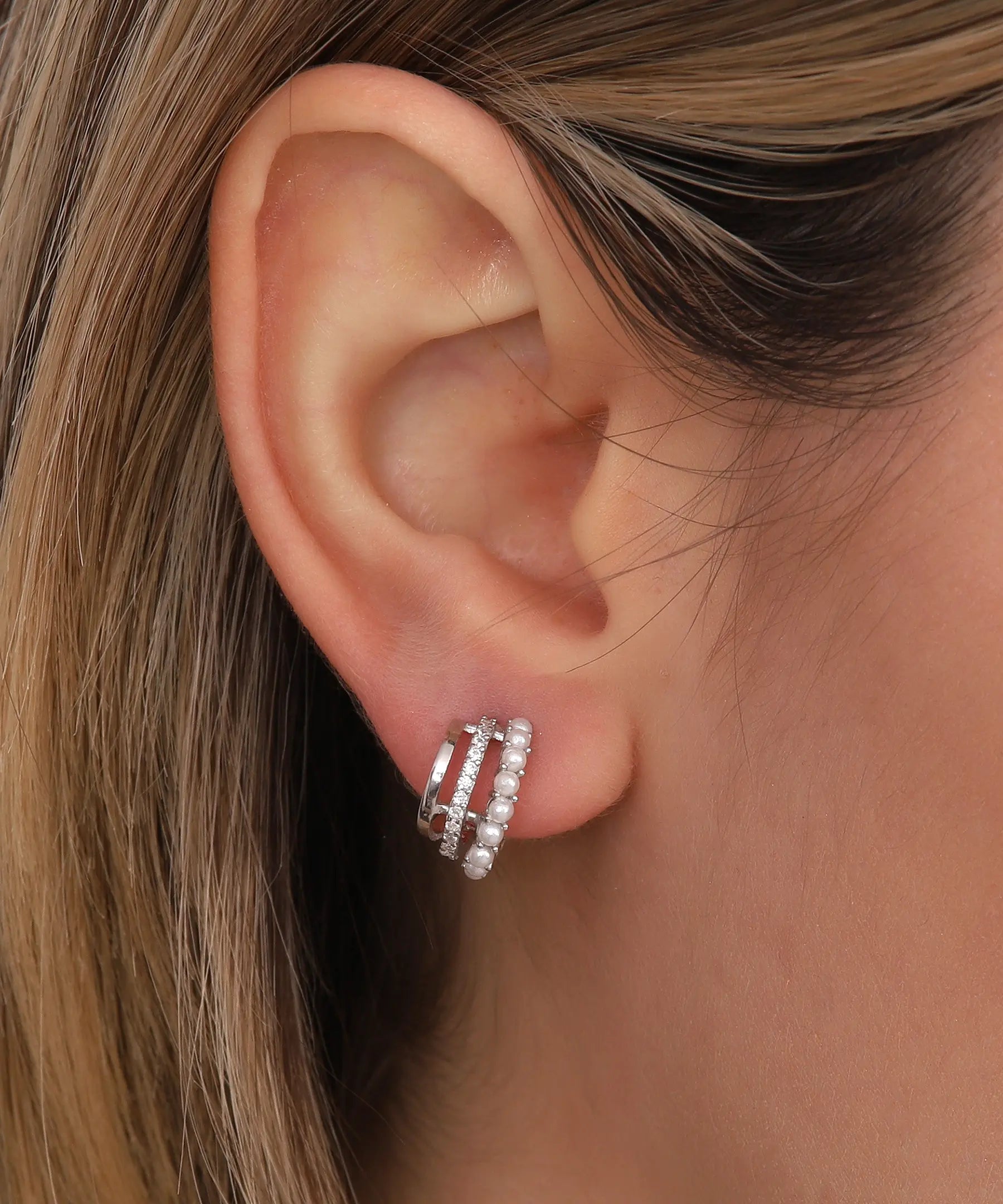 Modern Çift Halkalı İnci ve Taşlı Gümüş Küpe